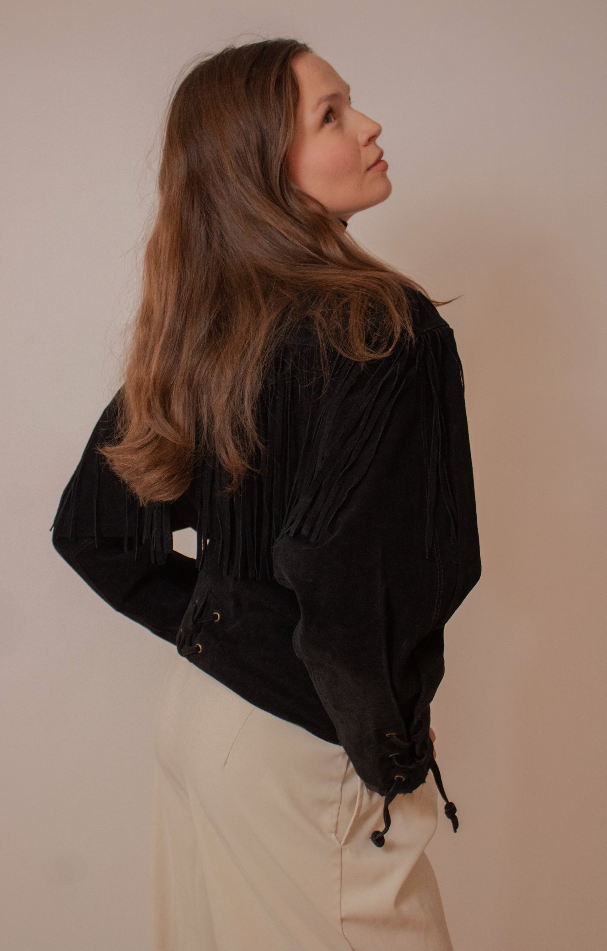 Black cropped suede fringe jacket